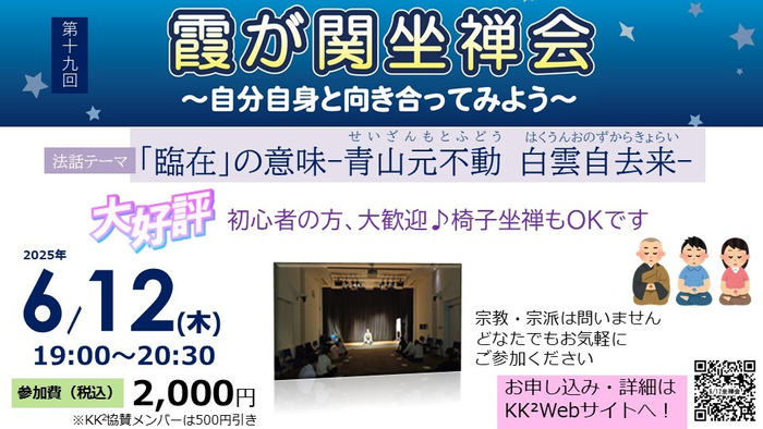 霞が関ナレッジスクエア(略称:KK² 所在地:東京都千代田区 運営:一般財団法人AVCC 理事長:久保田了司)は、2017年から仕事帰りに気軽に参加できる“坐禅”イベントとして「霞が関坐禅会」を開催してまいりました。この度、6月12日(木)に第十九回目となる霞が関坐禅会〜自分自身と向き合ってみよう〜を開催いたします。