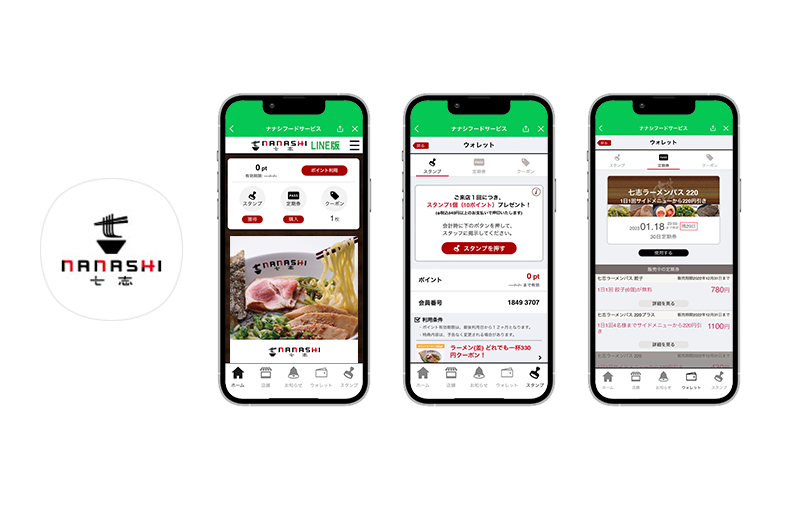 『七志LINEミニアプリ』は、とんこつラーメン専門店『七志』の会員向けアプリです。『LINE』のユーザーであれば二次元バーコードやURLを通じてアクセスし、新規にアプリをダウンロードすることなく簡単に会員登録できます。来店時には電子スタンプで来店ポイントが付与されます。また、30日間毎日値引きまたは無料サービスが受けられる定期券『七志ラーメンパス』の購入や利用も可能です。