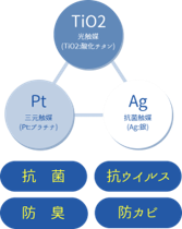 「delfino」は、光触媒(酸化チタン)、抗菌触媒(銀)、三元触媒(プラチナ)などの触媒を組み合わせることで、それぞれの触媒反応が持つ効果を相乗的に発揮させながら、それぞれの弱点を補うという発想の抗ウイルス・抗菌・防臭剤です。