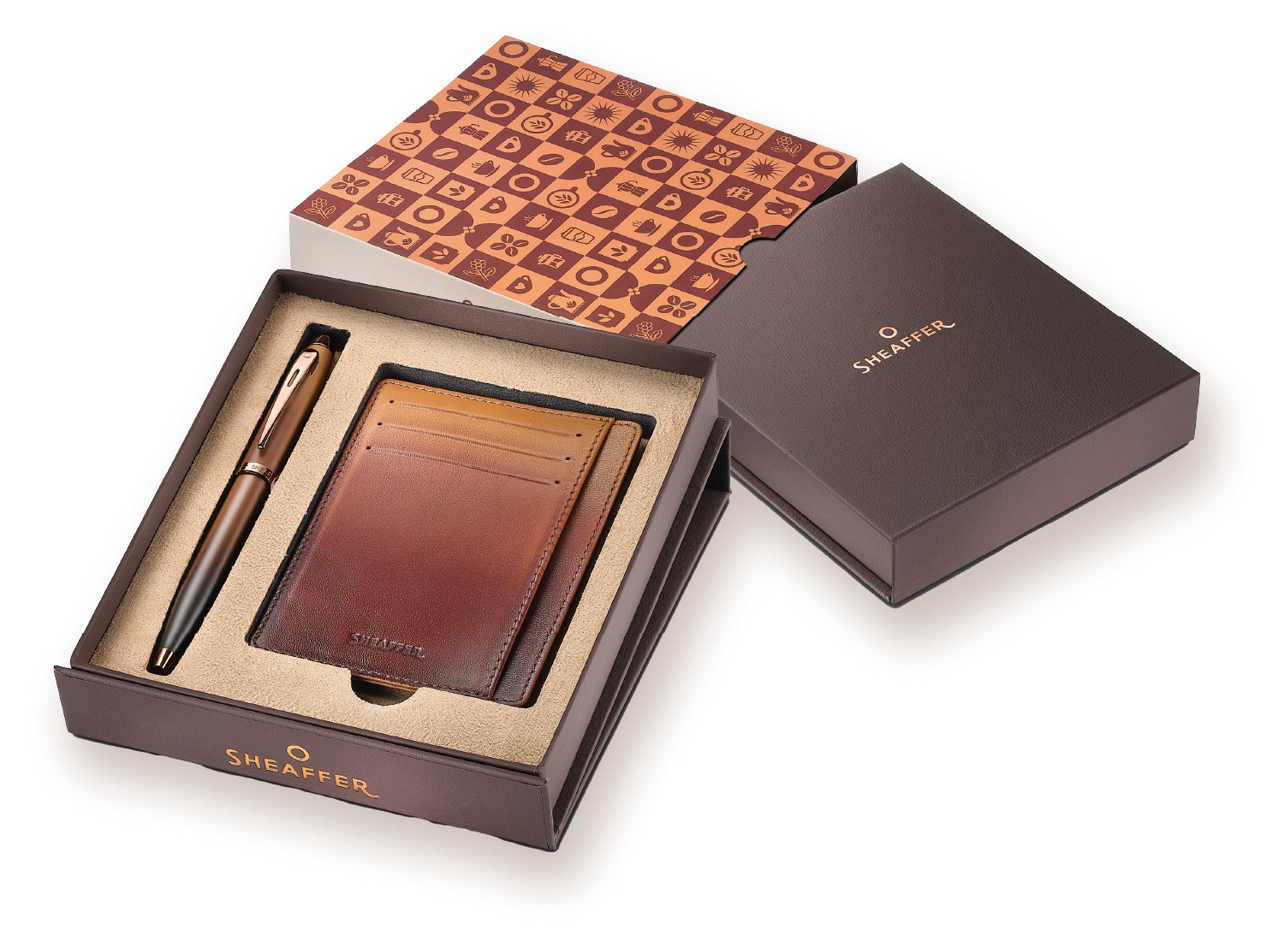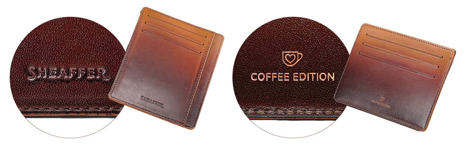 コーヒーエディションに共通するブラウングラデーションのカラーリングを施したカードケースのギフトセット。カードケースは、6つのカードスリットと、中央と側面の2ヶ所にフリーポケットが備わったコンパクトでシンプルなスタイル。高級感のあるリアルレザー製で、片面に「SHEAFFER」、もう片面にコッパ―カラーで「COFFEE EDITION」が刻印されています。