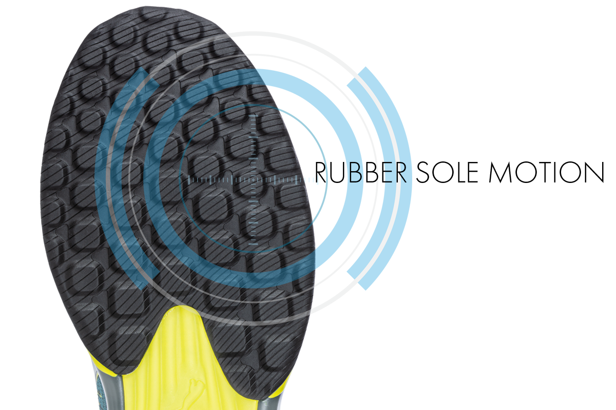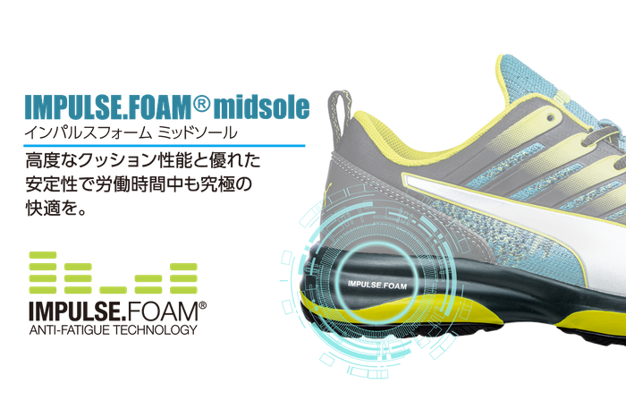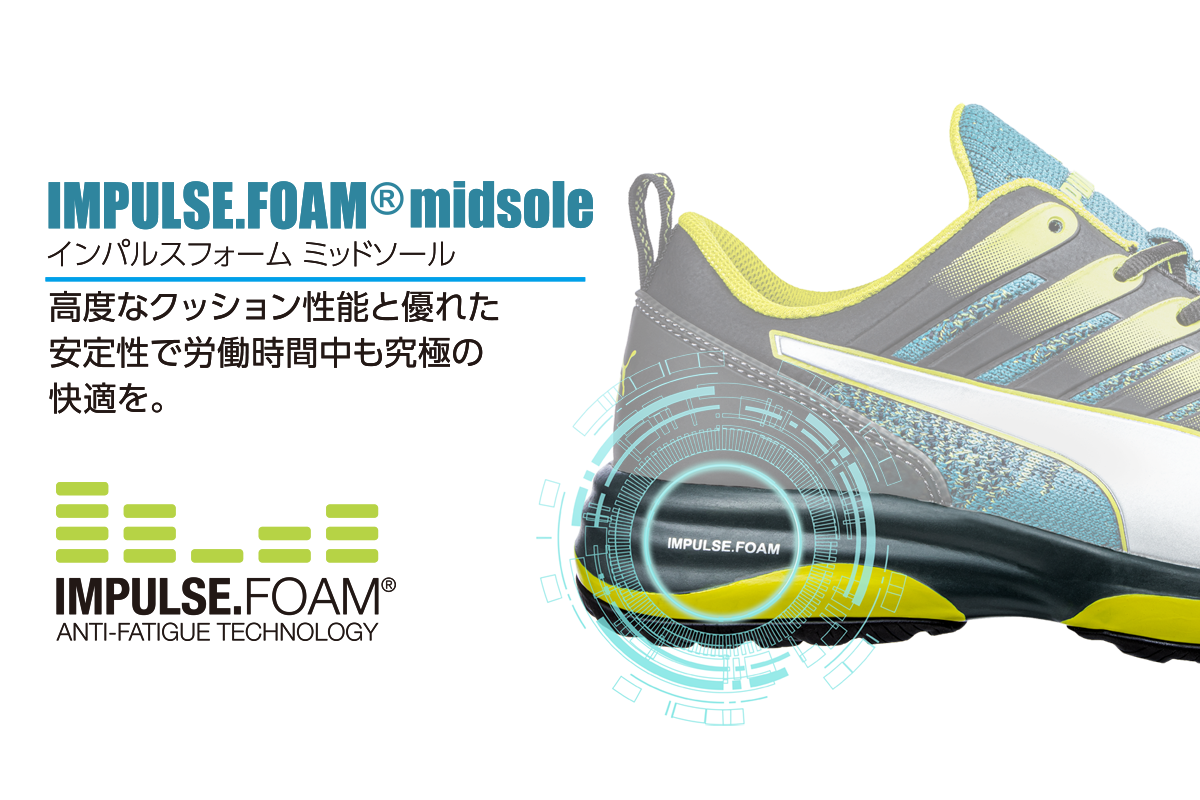 “インパルスフォーム”という独自開発のミッドソールを採用。足が接地したときに発生する衝撃力を瞬発力に変換します。そのクッション性は履き続けることで起こる疲労を軽減します。