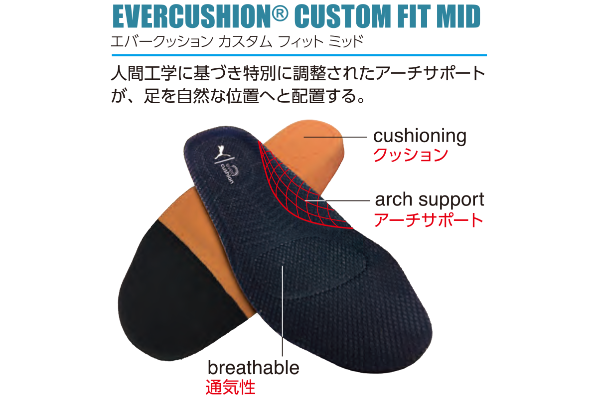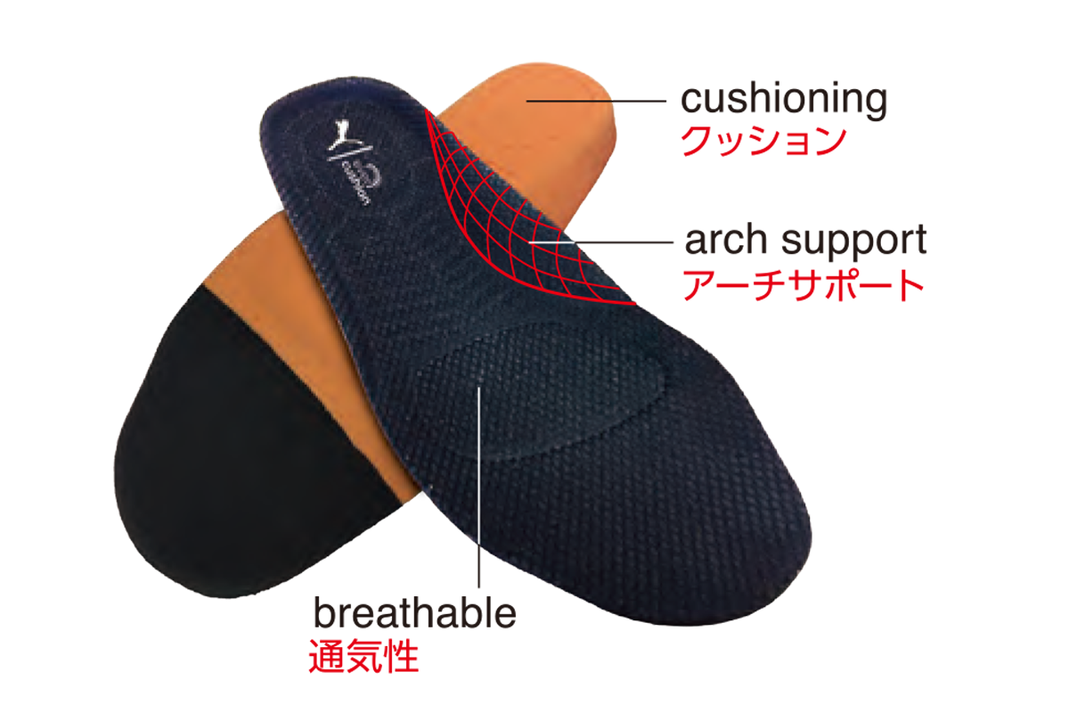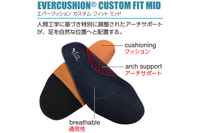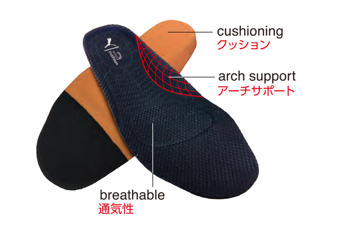 インソールは、人間工学に基づいてデザインされたアーチサポートが足を自然な位置へと配置します。また、靴内の湿気を調整し、より快適な履き心地を生み出してくれます。