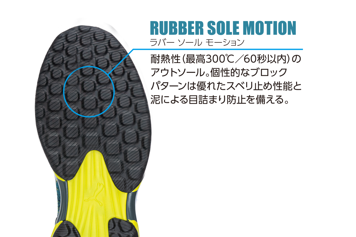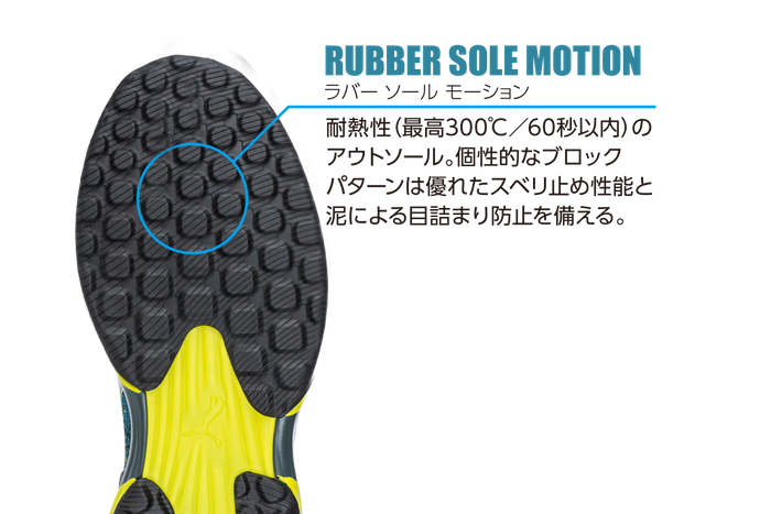 アウトソールは耐熱性(最高300°C/60秒以内)と個性的なブロックパターンによる優れた滑り止め性能と泥による目詰まり防止機能を有します。