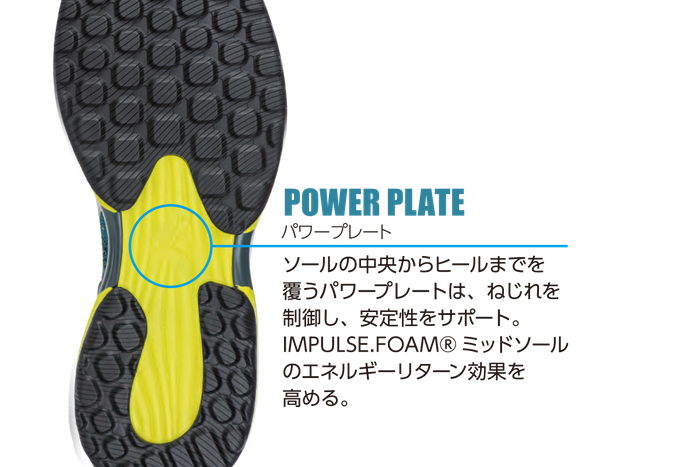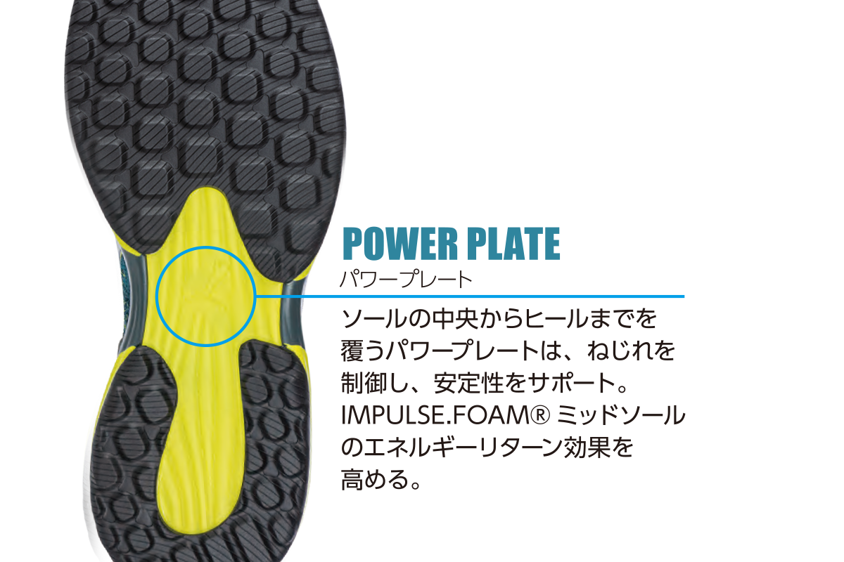 ソールの中央からヒールまでを覆う“パワープレート”は、ねじれを制御し、安全性をサポートすると共に、インパルスフォーム ミッドソールのエネルギーリターンの性能を更に高めます。