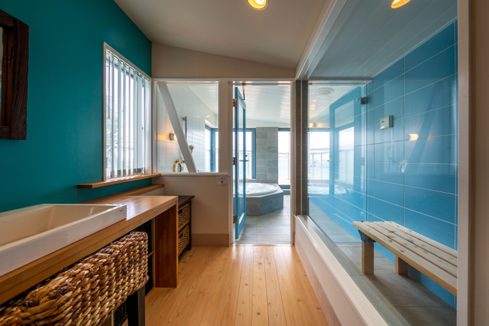 オーシャンビューのバスルームにはジェットバスとミストサウナをご用意。一棟貸別荘のプライべート空間なので親しい人間同士だけでサウナを楽しんだり、独り占めで自分好みの温度を設定するなど、最大限リラックスして“整う”サウナ体験がお楽しみいただけます。