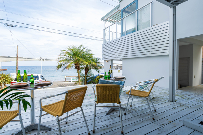 室内はデザインにこだわった快適空間で、2階の大きな窓とバルコニーからは海と空が広がる開放的なオーシャンビューが楽しめます。屋外にも海を一望する広々としたデッキテラスを備えており、アウトドア気分で汐風を感じながらお食事やご歓談をお楽しみいただけます。また、屋外シャワー(温水)を備えており、気軽に室内との出入りが可能なため、海水浴や磯遊びを楽しみたい方には最適な施設となります。さらにバスルームでは、ジェットバス・ミストサウナが完備されており、ゆっくり海を眺めながらの“整う”体験も楽しめます。