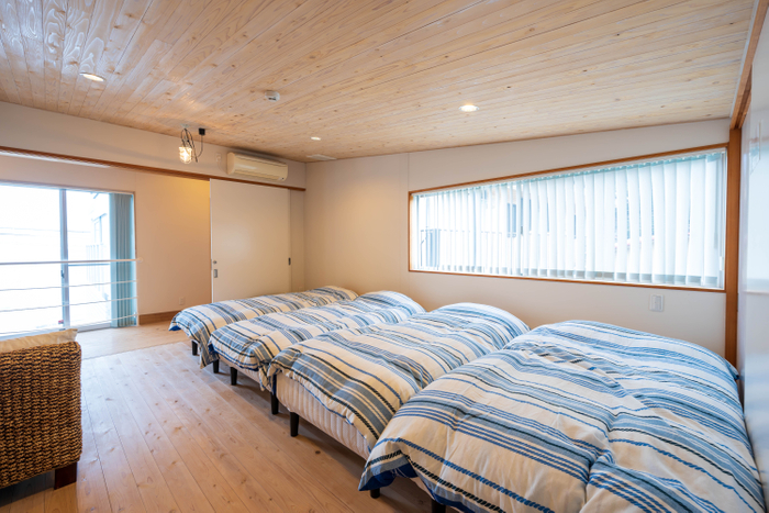 寝室は1F に和室(布団×4)と2F に洋室(シングルベッド×4)をご用意。※最大8 名様まで利用可