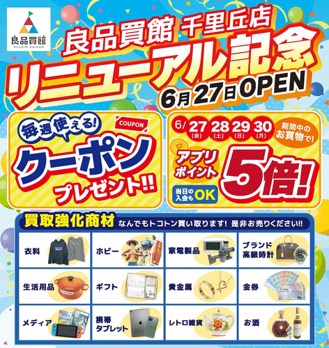 株式会社買取王国(本社:愛知県名古屋市、代表取締役会長:長谷川和夫、代表取締役社長:嶋本匡能、以下買取王国)は、東海地方を中心にリユースショップの店舗展開を行っています。大阪・奈良・兵庫を中心に店舗展開している大型総合リサイクル/リユースショップの「良品買館」も運営しております。このたび、2025年6月27日(金)に「良品買館千里丘店」がリニューアルオープンいたします。