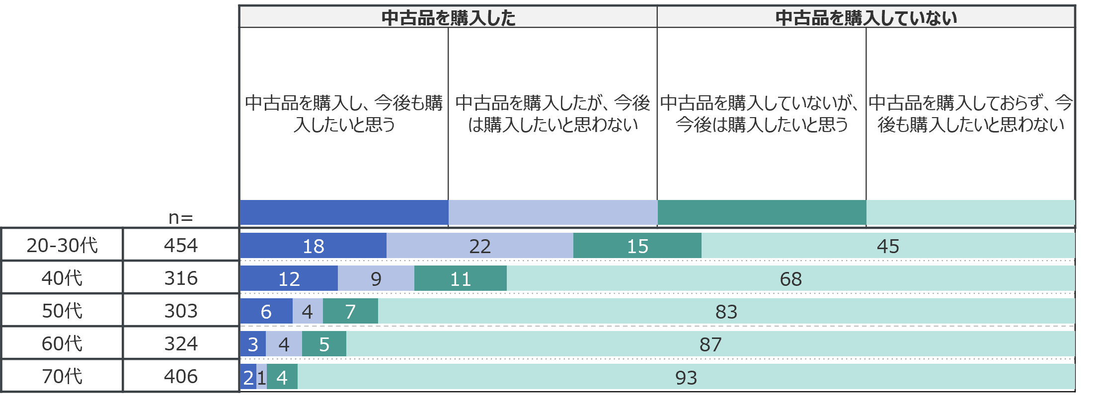 2023年にゴルフラウンドを行ったラウンド経験者に対しては、中古品の購入実態と今後の購入意向を更に紐解くため、年代別で特徴が見られるかを調査した。