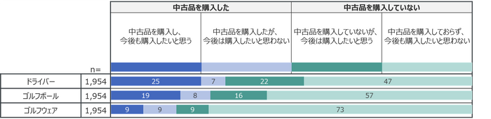 ・中古品の購入率はゴルフボール、ゴルフウェアと比較してドライバーが最も高く、全体の3割以上