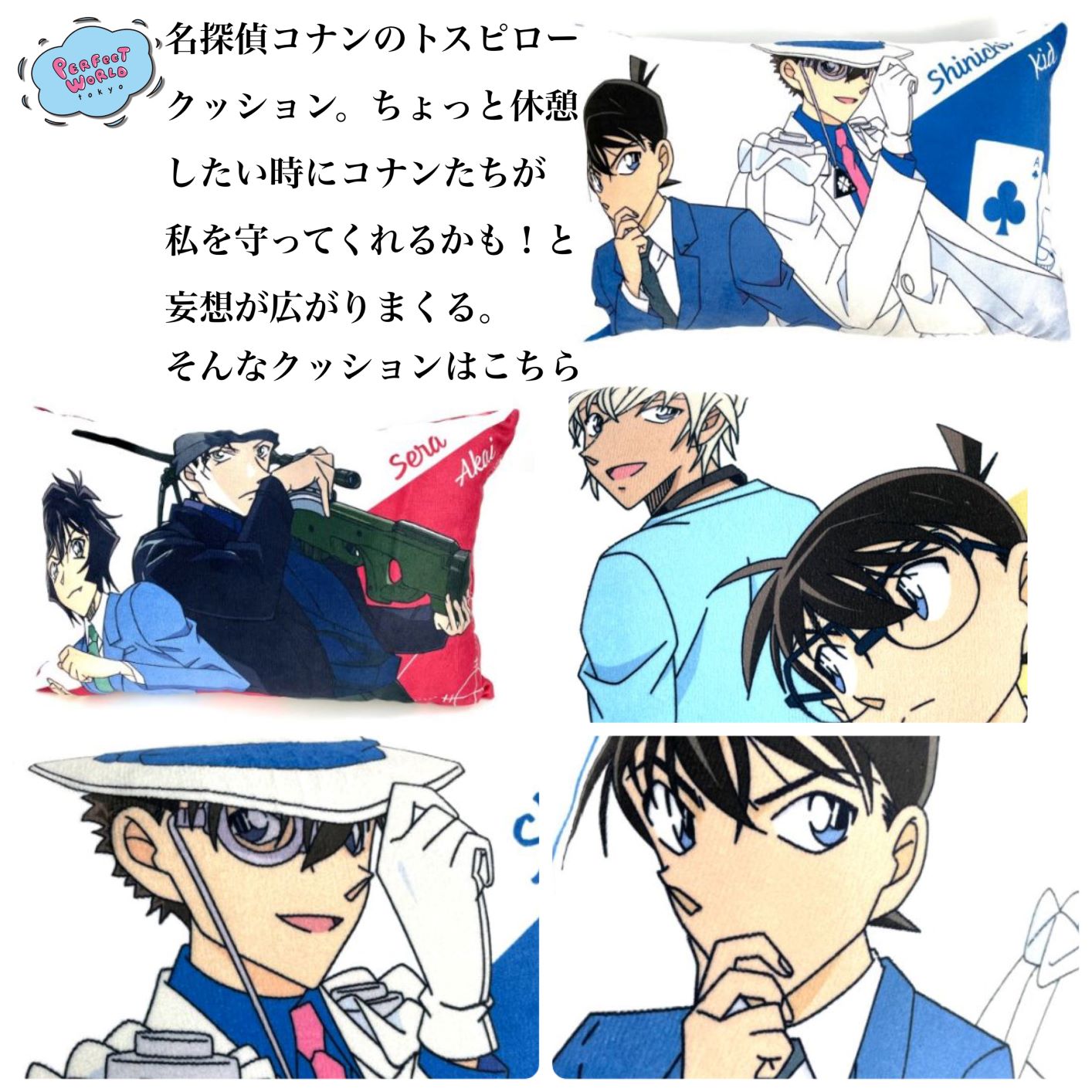 新一に怪盗キッドに、赤井さんに安室さんなどなど。。。名探偵コナンに登場するイケメンたちのグッズをお探しなら、ピッタリなものがありますよ♡その名も名探偵コナンのトスピロー クッション!「世の中には謎のままにしといたほうがいいこともある」わけですが、このトスピロー クッションは知っておいた方がいいアイテムです♪