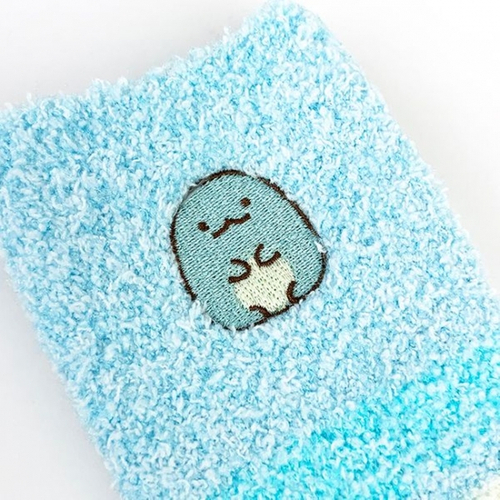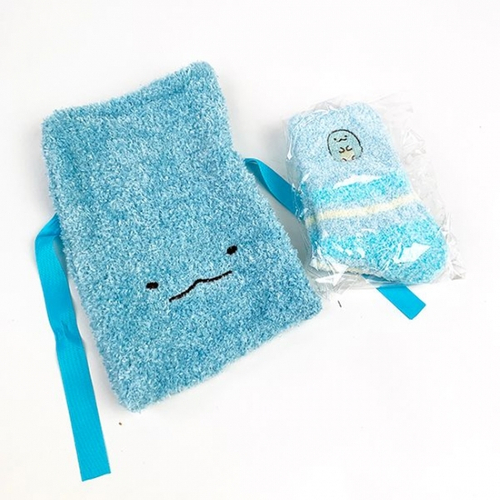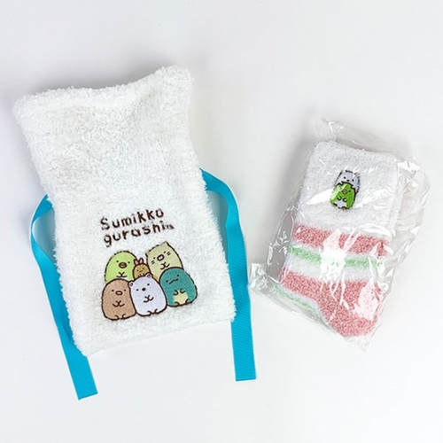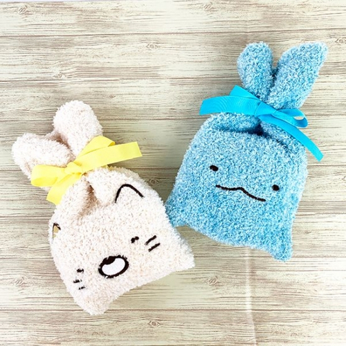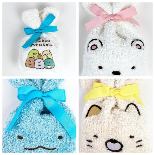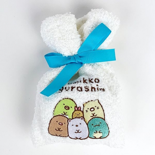すみっコぐらしのもこもこ靴下です。巾着もついているので、ギフトや旅行にも♪