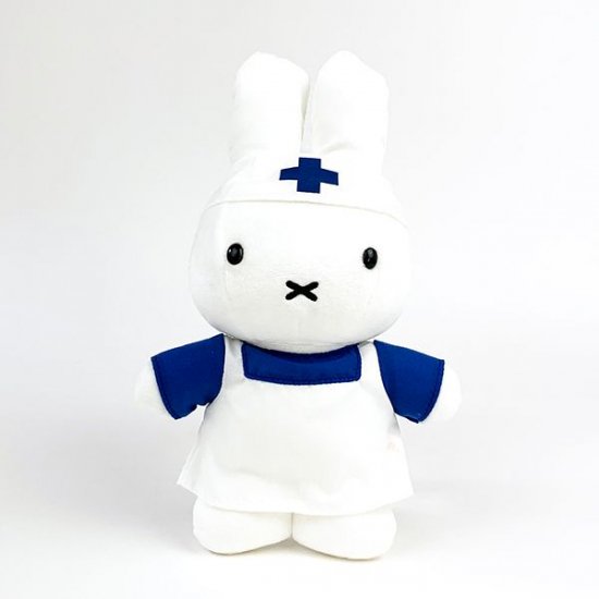 お次は、絵本の「うさこちゃんのにゅういん」の中に出て来たナース・ドールのぬいぐるみです。ナース姿のミッフィー、いつもよりキリっとした表情にも見えます。