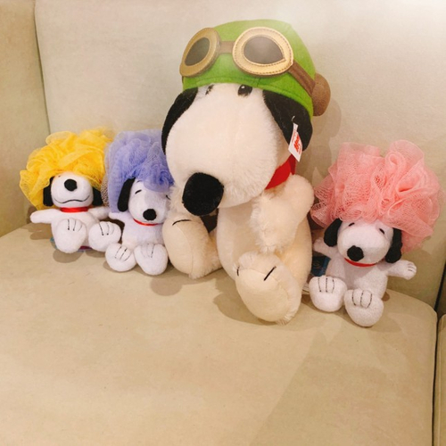 こちらは、ソファーに座っているスヌーピーです。小さなスヌーピーに囲まれていて、心なしか朗らかな表情をしているようにも見えます。「フライング・エース」の頼りがいのある一面が見えるショットです。