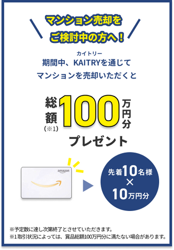 総額100万円分ギフトカードプレゼントなど!マンション売るなら『KAITRY』2周年キャンペーン