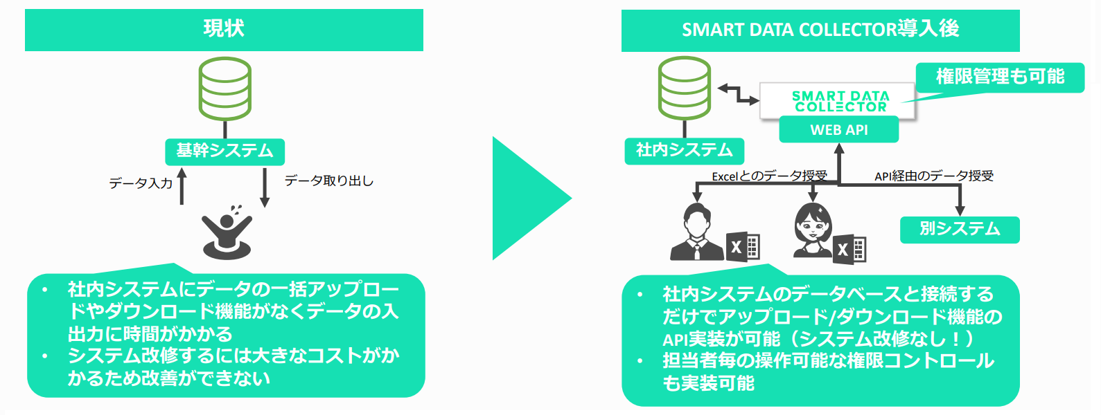 既存システムのダウンロードやアップロード機能が充実しておらず、非効率な業務が強いられている場合、スマコレ for DB を導入すれば簡単にExcelやAPI経由でデータを取り出し/登録ができます!