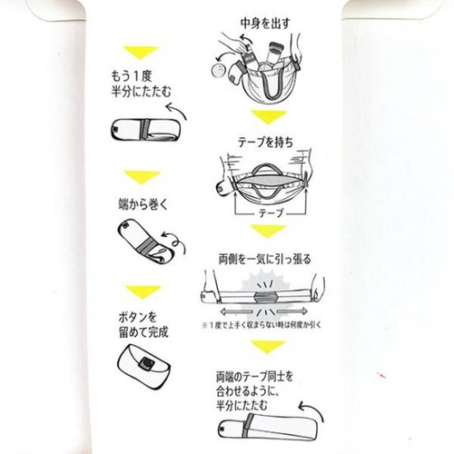 画像のように、使い終えたら中身を取り出します。両端のテープ部分を持って一気に両側に引っ張ると、棒状に。それを折りたたんで巻いていき、最後にボタンを留めればコンパクトな状態に元通り♪