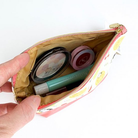 今回ご紹介するポーチは2種類です。まず1つめはこちらのフルーツいっぱいキャラメルポーチ♪フルーツにちょこんと乗った2匹が可愛すぎるデザイン。