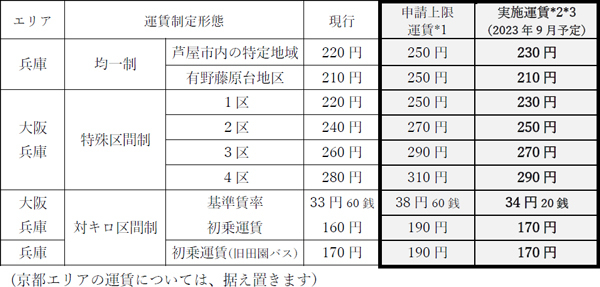 上限運賃平均値上げ率 大阪エリア12.13% 兵庫エリア10.71%