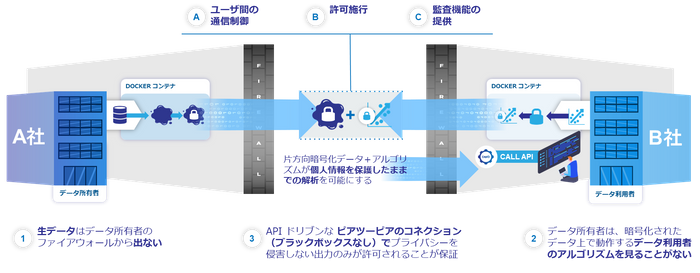 TripleBlindは、企業のデータプライバシーとセキュリティ保護のために、複数の特許を取得した独自の秘密計算技術を開発・提供しています。この技術は、データそのものを暗号化して通信していたこれまでの技術・暗号化方式とは異なり、データの所有者はファイアウォールから「生データ」を出さず、データの利用者はファイアウォールの外側に「アルゴリズム」を見せずにセキュアなデータ共有を行う「仮想データ交換」によって、高いパフォーマンス、セキュリティ、ユーザビリティを提供できます。これにより、日本の個人情報保護法や欧州連合の一般データ保護規則(GDPR)といった最新の規制基準を遵守したうえで、個人情報や医療情報などの規制対象データや、健康記録や銀行取引などの機密データをセキュアに共有、利用、商用化できるようになります。