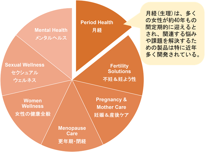 月経(生理)は、多くの女性が平均約40年もの間定期的に迎えるとされ、女性にとっては人生の大半に自然に起こることでありながら、場合によってはさまざまなことへの機会損失の原因となりえます。また、そのための関連費用や、使い捨て用品に対する懸念といった意識も消費者間において高まっているとされ、現在フェムテック市場の中でも特に多くの製品開発がされている分野と言えます。