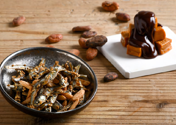 アーモンドにキャラメルパウダーとカカオパウダーをまぶし、スイーツのようなオサカーナに仕上がりました。甘じょっぱい味で、手が止まらなくなります。