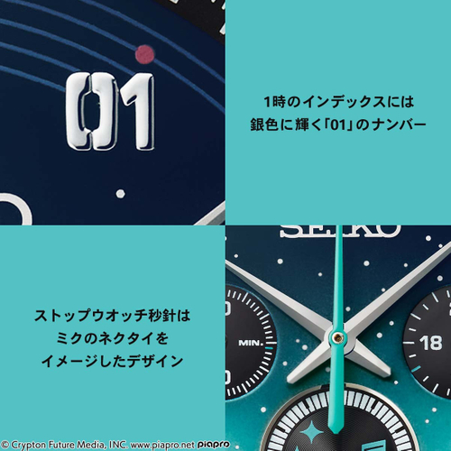 1時のインデックスには銀色に輝く「01」のナンバー。ストップウオッチ秒針はミクのネクタイをイメージしたデザインとなっています。