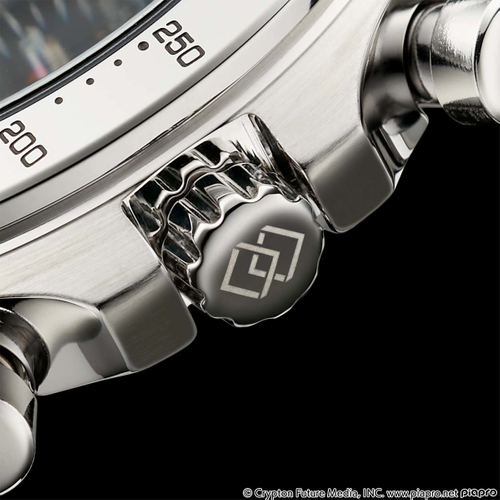 16分音符や「HATSUNE MIKU」のネームがあしらわれた小秒針のインダイヤル。外周には鍵盤がデザインされています。