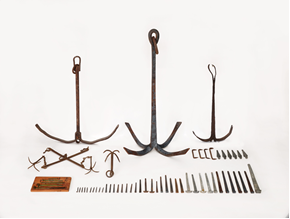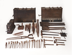 なかでも,全国的な産地として知られた船釘(ふなくぎ)や錨(いかり)などを製作する鍛冶用具が一式そろっており,鞆の鍛冶職人の技術を知ることができる。
