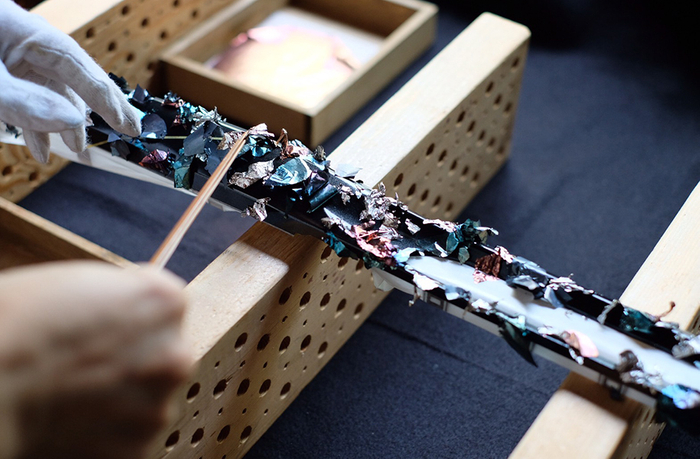 シンプルで合理的にデザインされた車内に、熟練の職人技によって綿密に計算された「箔の美」を取入れる。 空間を引き立てる、陰影による奥行きを表現するために、箔を振り落としては剥がし寂びた様子を残しながら複数の層をつくり出していきます。 アートピースをつくるように、インテリアパネルを装飾します。