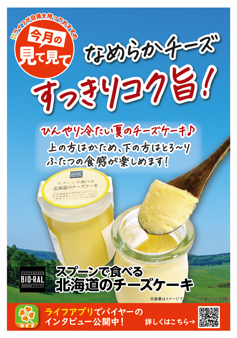 暑くなり、食欲が落ちてくる季節でも、ライフでしか味わえない絶品スイーツをお客様にご提供したいと思い、開発いたしました。BIO-RAL瓶デザートシリーズの新商品となる「スプーンで食べる北海道のチーズケーキ」は、チーズの濃厚な味わいの中にさわやかさも感じられる、夏の時期にぴったりなスイーツに仕上がりました。北海道産の原材料をふんだんに使用したBIO-RALならではのこだわりの商品です。上層はしっかり、下層はとろりとした二層に分かれており、食感の変化もお楽しみいただけます。ランチの食後のデザートとして、また疲れた時や頑張った時のご褒美として、幅広いシーンでお召し上がりいただけますと幸いです。
