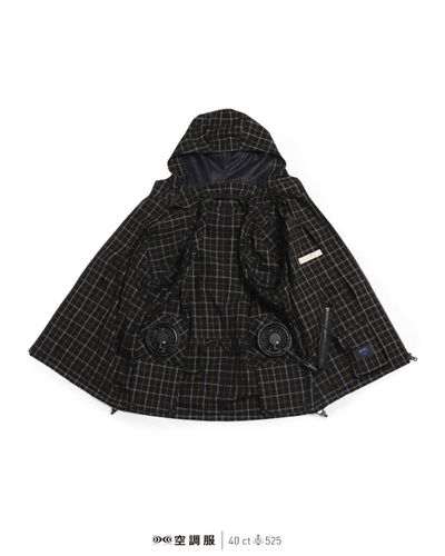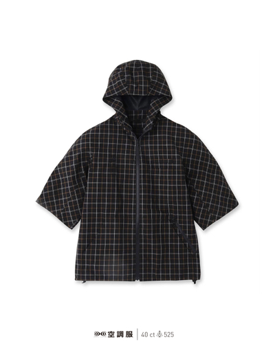 シャツは天然繊維にこだわったコットンタイプタイラー生地を採用。ボタンダウンシャツ特有の清潔感のある佇まいに。ブルゾンタイプはコットンチェックウェザー生地を採用。腕の可動域を広げる工夫を凝らしたキモノスリーブと比翼仕立てのジップアップフロントに加え、頭の形に沿いつつ空気の流れを考慮したフードなど、緻密なパターンメイキングを駆使したつくりが特徴。またゆとりを持たせたサイジングは、空気が入った際に十分風が流れるように設計され、随所に付属するパーツにより調整が可能です。