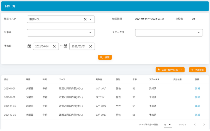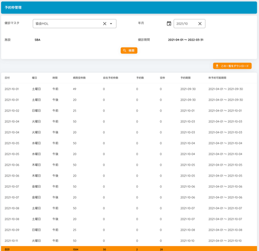 ●企業向け:社員登録、健診マスタ管理、予約枠管理、予約管理、健診結果閲覧