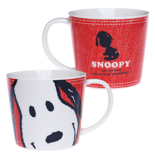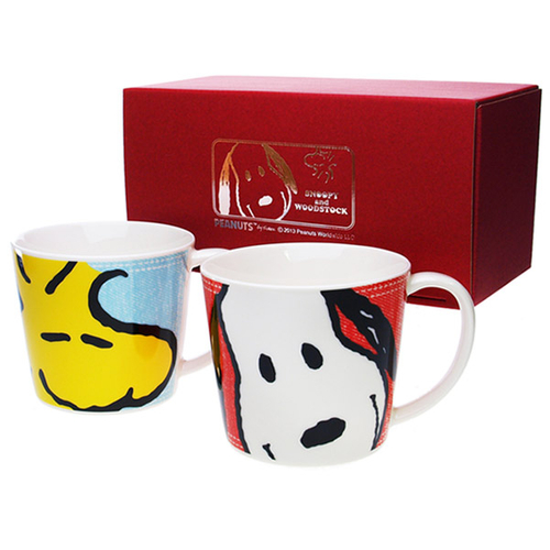 仲良しのスヌーピーとウッドストックのペアマグです。どちらも笑顔でキュートなデザインですね♪デニム風にデザインされた背景もオススメです。