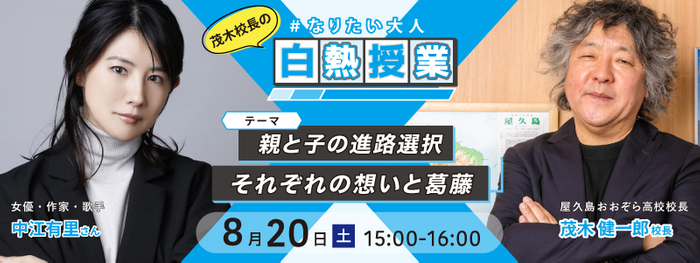 2021年から実施しております茂木校長によるなりたい大人白熱授業。8月は大阪出身の作家で女優の中江有里さんをお招きします。著書「万葉と沙羅」では、通信制高校に通う娘と母親の関係についてリアルに描かれています。これから高校選択をする中学生や在校生に向け、進路について真剣に向き合う授業を予定しています。