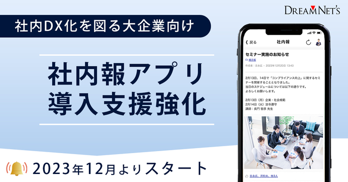 株式会社ドリームネッツ(本社:広島県福山市、代表取締役社長:井上 一成)は、スマホで簡単に操作できる社内報アプリにおいて、社内のDX化を目指す大企業を支援する目的として、2023年12月より導入支援強化を実施いたします。