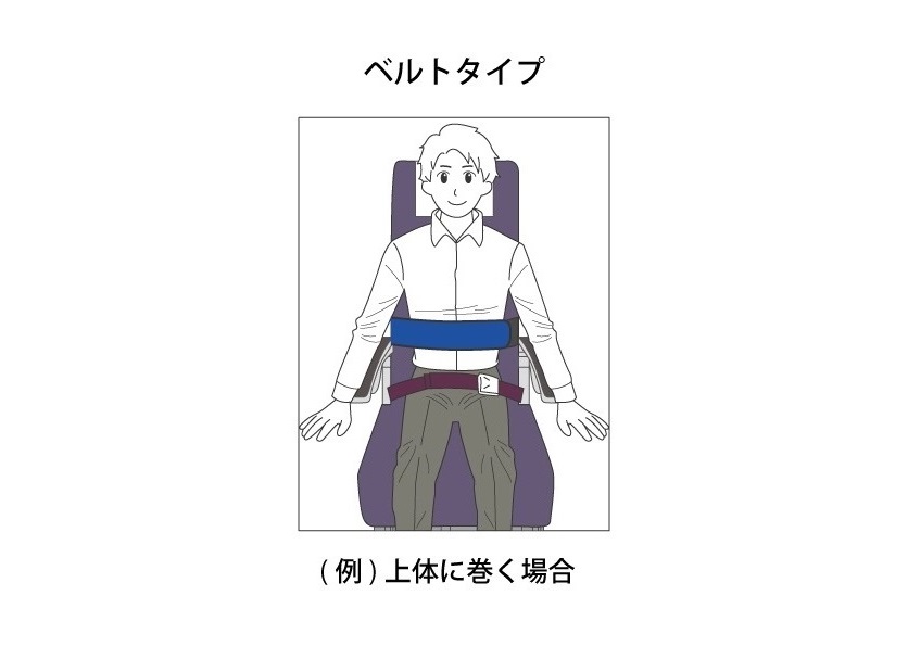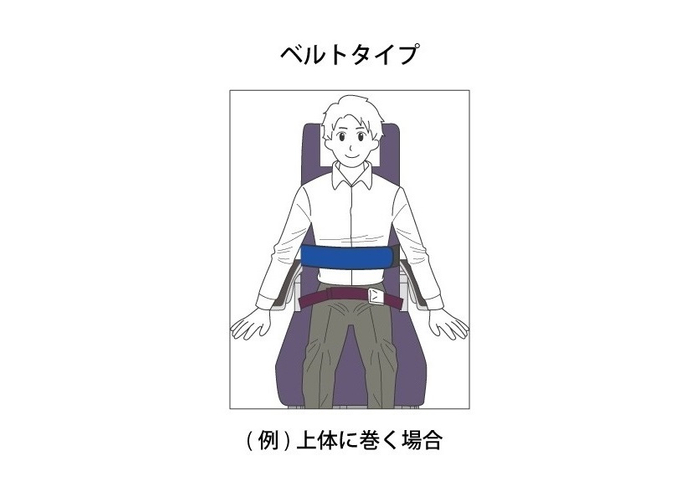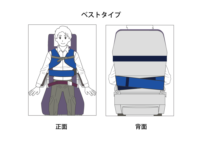 本製品は、座席のシートベルトを着用した上で、上体を座席に固定するための座位補助ベルトです。特に、身体が不自由な方や病気、ケガなどの理由により座位を保つことが困難・補助が必要なお客さまを対象としています。本製品には「ベストタイプ」と「ベルトタイプ」の2種類があり、身体の状態に合わせてご利用いただけます。