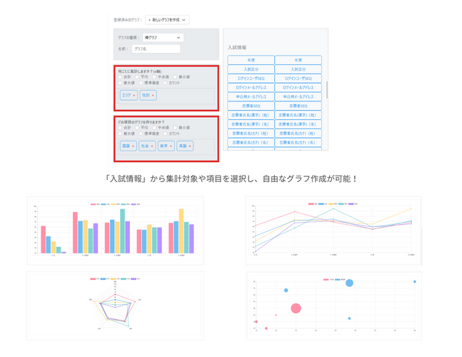 「募集活動の結果を見える化したい」「入試状況の推移を知りたい」「特定のイベントと出願の関連性を分析したい」——そうした多様なニーズに対応できるよう、カテゴリや項目を自由に選択できるグラフ作成機能を新たに搭載しました。集めたデータを目的に応じて組み合わせ、最適なグラフを表現することで、入試・広報業務における課題の可視化が可能です。