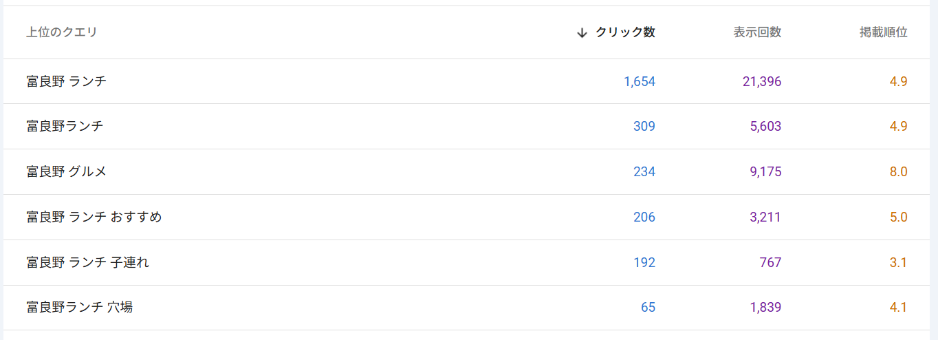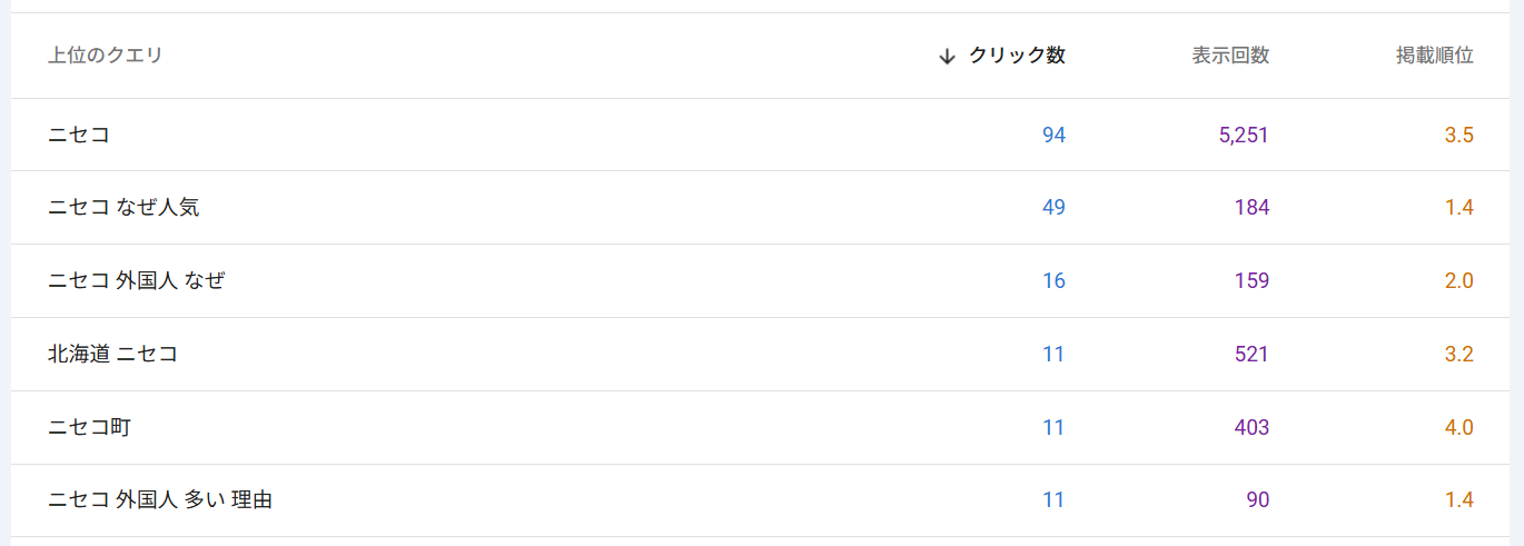 一方、右は観光に関する検索クエリが並んでいますが、先ほどとは打って変わってインプレッション数が軒並み多く、これらのキーワードは一般的に広く検索されていることが分かります。