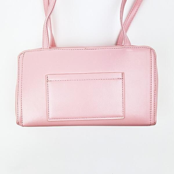 四角く、しっかりした作りの本体に、長いハンドルがついたちょっと変わったショルダーバッグ。持ち手が長いので、肩にかけるのもスムーズです。チャックなどの金具部分は、ゴールドで高見えUP!