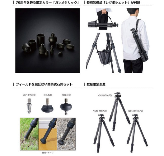限定カラーとして堅牢なカーボン三脚にふさわしい落ち着いた光沢のガンメタリックアルマイトを採用しました。また、携帯時はストラップとして、撮影時はストーンバッグとして使える「レグポシェット」を特別装備。さらにスパイクや可変石突など、多彩な撮影シーンに対応する石突セットも付属。70周年を記念した70台限定生産のプレミアムモデルです。