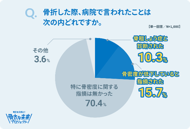 ・骨折した際に「骨粗しょう症と診断された」、または「骨密度が低下していると指摘された」と回答した人が合計で26%存在することがわかりました。