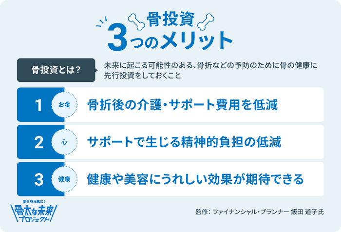 この度、本プロジェクトが2025年9月に実施した「骨折に関する実態調査」により、骨折がもたらす精神的および経済的な負担が明らかになりました。今回の調査結果を受け、『骨太な未来プロジェクト』では、「骨の健康」への積極的な取組みとして、「日々の運動」「食生活」「生活習慣」の改善に努め、将来的な骨折を未然に防ぐ「骨投資」を推奨します。