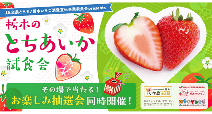 全国農業協同組合連合会栃木県本部(以下、JA全農とちぎ)は、栃木県内の「あしかがフラワーパーク」「東武ワールドスクウェア」「那須どうぶつ王国」にて、栃木県産のいちご“とちあいか”の試食会を実施いたします。
