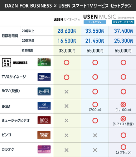 株式会社U-NEXT HOLDINGS(本社:東京都品川区、代表取締役社長CEO:宇野 康秀)のグループ会社である株式会社USEN(本社:東京都品川区、代表取締役社長:貴舩 靖彦、以下、USEN)とスポーツ・チャンネル「DAZN(ダゾーン)」は、BtoB市場で初めて※商業施設向けスポーツ配信サービス「DAZN FOR BUSINESS」をUSENが提供するスマートTV(USEN MUSIC Entertainment、USENサイネージ TV)に搭載した飲食店向けセットプランを、本日2024年11月13日より販売開始したことをお知らせします。