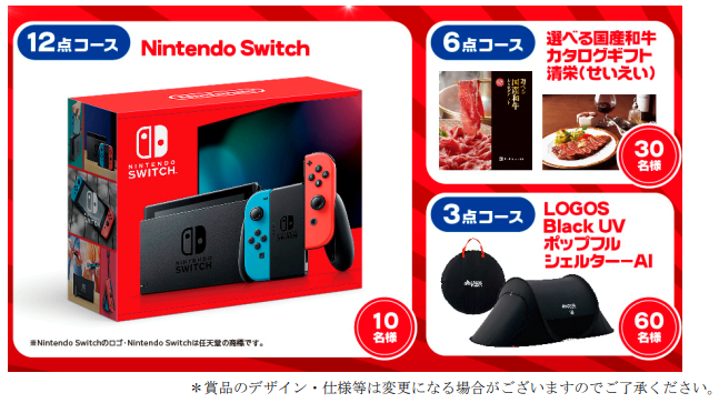 対象商品を3点購入いただいた場合は3点コース「LOGOS Black UV ポップフルシェルター-AI」、6点購入いただいた場合は6点コース「選べる国産和牛カタログギフト清栄(せいえい)」、12点購入いただいた場合は12点コース「Nintendo Switch」にご応募できます。また、各コースの抽選にもれた方の中からも「Wチャンス」として500円分のAmazonデジタルギフトが当たります。