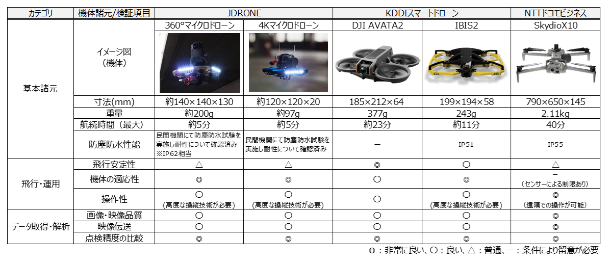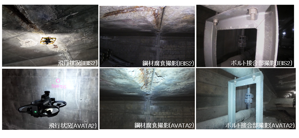 本実証では、狭小(閉鎖)空間において飛行可能である様々なドローンを用いて、機体特性の把握と構造物の健全性確認や遠隔地からの状況把握が可能であることを確認しました。
