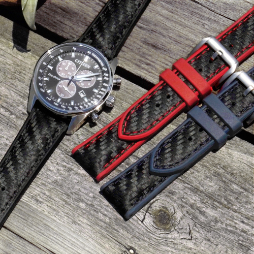 薄いテックタフの膜をレイヤー状に重ね、カーボン調の風合いを表現したデザインに。耐傷性が高く、普段使いにできるラバーのような手触りが特徴です。裏材のラバーは黒、青、赤の3種。高級感のある素材で、スタイリッシュなデザインです。