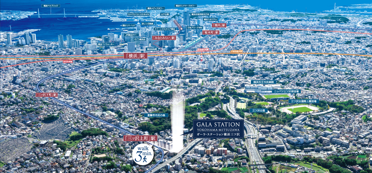 「ガーラ・ステーション横浜三ツ沢」は、最寄り駅である「三ッ沢上町」駅まで徒歩3分という利便性の高さに加え、横浜の都市風景を間近に感じられる至便の立地に誕生。「三ツ沢公園」をはじめ緑豊かで暮らしやすい住環境が整うほか、駅周辺にはスーパーやコンビニ、グルメスポット、クリニックなどの生活利便施設が充実しています。さらに、「横浜」駅周辺の商業施設や飲食店も普段使いできる高感度なロケーションで、快適な都市生活を享受することができます。