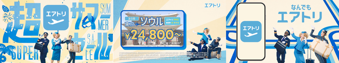 既存の「モーション篇」から背景アニメーションを刷新し、エアトリサービスで取り扱う様々な旅行商品が登場する新CMです。また現在実施中のエアトリ超サマーセール訴求版もあります。以前のCMからどこが変わっているのか探してみてください!